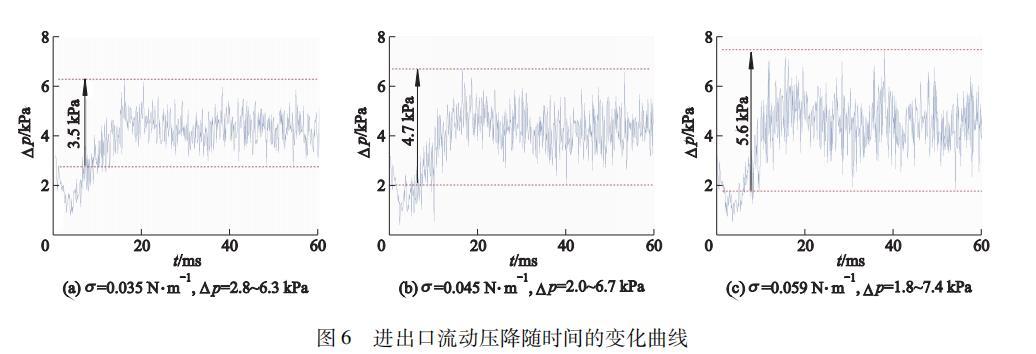 通道進出口汽液兩相的總體壓降Δp常作為衡量流動是否穩(wěn)定的標準。σ分別為0.035,0.045,0.059 N·m?1時,通道進出口壓降Δp隨時間的變化曲線如圖6所示。20 ms之后,微通道內(nèi)的汽液兩相流進入相對穩(wěn)定的充分發(fā)展狀態(tài),在20~60 ms的時間間隔內(nèi),3種表面張力對應(yīng)的Δp的波動范圍分別為2.8~6.3,2.0~6.7,1.8~7.4 kPa。σ=0.035 N·m?1時,Δp波動幅度最小,與σ=0.059 N·m?1相比,Δp波幅減小約2.1 kPa??梢哉J為,減小表面張力σ,汽液兩相的壓降波動幅度減小,汽液兩相流的流動穩(wěn)定性提高。