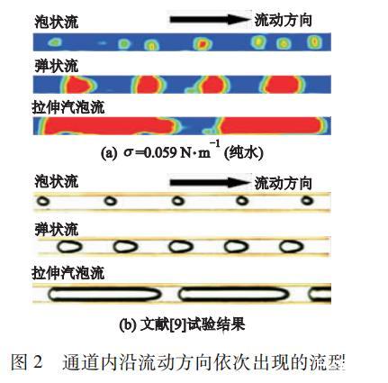 通道內(nèi)沿流動方向依次出現(xiàn)的流型如圖2所示,圖2a為σ=0.059 N·m?1(純水)條件下,數(shù)值計算得到的微通道內(nèi)汽液兩相呈現(xiàn)的流型。不難看出:沿流動方向依次出現(xiàn)泡狀流(汽泡呈球形)、彈狀流(汽泡呈前端橢球,中間圓柱體,尾端近扁平狀)和拉伸汽泡流(汽泡在微通道內(nèi)受限,呈拉伸的柱形)3種流型。這與通過沸騰試驗得到的490μm矩形通道內(nèi)觀測段的流型及汽泡形態(tài)(圖2b)一致。此外,數(shù)值模擬結(jié)果還與其他文獻中的試驗結(jié)果進行比對,結(jié)果表明:計算模型與數(shù)值方法可行,計算結(jié)果與試驗數(shù)據(jù)吻合較好。
