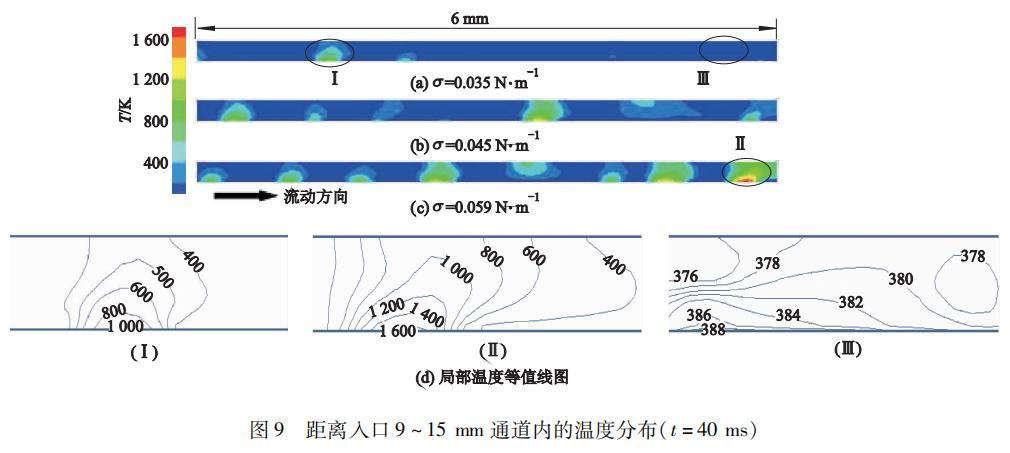 t=40 ms時,距離入口9~15 mm處通道內(nèi)的溫度分布云圖如圖9所示。