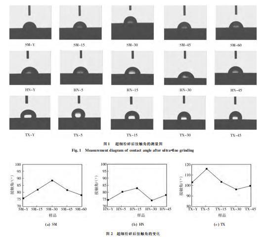 3種煤樣超細粉碎后的接觸角變化見圖1、2??梢钥闯?,變質(zhì)程度高的太西煤的接觸角在100°左右波動,明顯大于神木不粘煤和淮南氣煤的接觸角(在75°左右變化)。還可以看出,濕法超細粉碎后3種變質(zhì)程度煤樣的接觸角的變化規(guī)律相似,在短時間的濕法超細粉碎后,接觸角變大,疏水性增強,隨著超細粉碎時間的延長,接觸角減小。總體來看,神木煤與淮南煤在濕法超細粉碎后的接觸角大于超細粉碎前的,說明對于低階煤,在濕法超細粉碎后,煤顆粒表面的疏水性在一定程度上有所增強,潤濕性減弱;太西煤在濕法粉磨30、45min后的接觸角小于超細粉碎前的,由此可得,對于高階煤,長時間進行濕法超細磨礦會劣化煤顆粒表面的疏水性。