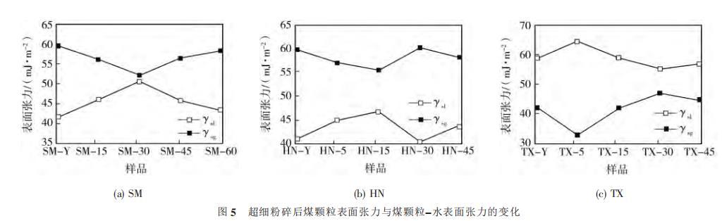 圖5超細粉碎后煤顆粒表面張力與煤顆粒-水表面張力的變化