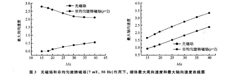 圖3 無磁場和非均勻旋轉(zhuǎn)磁場(7 mT、50 Hz)作用下,熔體最大周向速度和最大軸向速度曲線圖
