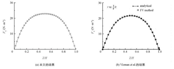 本文對液橋的三維網(wǎng)格進行了有效性驗證,最終采用60×68×60的非均勻計算網(wǎng)格。為了驗證計算程序的可靠性,本文對Vizman et al。文中的Rayleigh-Bénard結(jié)構(gòu)的算例進行了重復。(采用導電的鎵熔體材料的相關(guān)參數(shù)為:密度ρ=6。1×10^3 kg/m^3,熱膨脹系數(shù)β=1。26×10^-4 /K,動力學粘度ν=1。907×10^-7 kg/ms,擴散系數(shù)κ_T=9。22×10^-6 kg/ms,電導率σ=3。87×10^6 A/Vm)。圖2為二極對非均勻旋轉(zhuǎn)磁場下,本文計算得到的熔體在r=3R/4處周向方向的洛倫茲力的分布曲線(a)和文獻結(jié)果(b)。由圖可知,熔體在r=3R/4處熔體周向的洛倫茲力呈拋物線型分布,并在z=0。5H處達到最大值。本文的計算結(jié)果與Vizman et al。的結(jié)果較好地吻合,且計算所得的周向洛倫茲力的最大值與Vizman et al。通過數(shù)值計算和實驗得到的最大值的相對誤差為1。8%。該結(jié)果驗證了本文計算程序的可靠性。