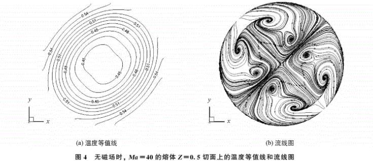 圖4 無磁場時, Ma=40的熔體Z=0。5H切面上的溫度等值線和流線圖