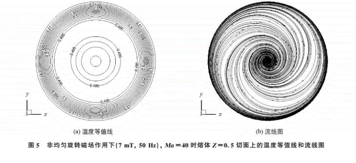 圖5 非均勻旋轉(zhuǎn)磁場作用下(7 mT, 50Hz), Ma=40時熔體Z=0。5H切面上的溫度等值線和流線圖