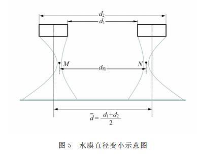 圖5給出了水膜直徑變小示意圖。吊環拉出的水膜,其內表面、外表面都是雙曲面,但不對稱。一般而言,外表面的曲率半徑較小,而內表面的曲率半徑較大,2個曲面頂點處的位置(圖5中M和N所示)將偏離吊環內、外徑的平均值d?=(d1+d2)/2,如圖5中的豎直虛線所示。所以水膜斷裂處的直徑d斷,將小于吊環的d?,即d斷 < d?。由表2數據可以看出,隨著吊環直徑的減小,對應水膜的內、外曲面的不對稱程度增加,斷裂處水膜直徑的收縮程度("頸縮")增大,所以2個直徑的比值d斷/d?變小。