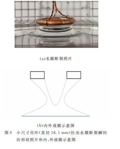 另一方面,對于尺寸較小的吊環,如圖6所示,水膜的內表面將連接在一起,只有外表面的表面張力起作用,但在計算公式中,仍以2πd?代入式(5)中,所以表面張力系數的計算值偏小。標準環的尺寸適中,環壁很薄,所以圖1(c)與圖1(d)水膜形狀近似相同,實際測量的F等于U斷前,因此計算得到的α2誤差很小。可見,選用水膜斷裂點計算的表面張力系數的影響因素很多,實際斷裂點的瞬間位置、吊環尺寸、吊環厚薄等都是需要考慮的因素。