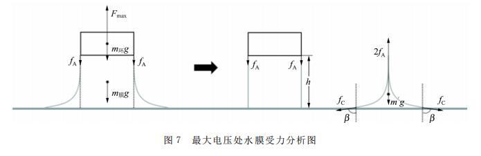 采用隔離法,對電壓最大值處的水膜進行受力分析。圖7中虛線將水膜分成2部分,吊環正下方的水膜由于水分子相互吸引力附加在拉力Fmax中,而另一部分水膜的重力m′g,與2fA以及水膜與液面處的表面張力2fCcosβ,三者形成平衡狀態,即受力分析與水膜斷裂時[圖1(d)]m2的受力相似。所以計算水膜的重力僅僅需要考慮吊環正下方的重力即可。另外,電壓最大值處的水膜穩定性最好,拉升高度h容易測量。對于尺寸較小的吊環(πd?=78.2 mm),電壓最大值處,水膜的內表面沒有連接在一起,仍然與液體表面接觸良好,所以測量的誤差也較小(Eα1=3.9%)。但是對于特別小的吊環(πd?=57.4 mm),水膜的內表面連接在一起,其表面張力系數明顯偏小。