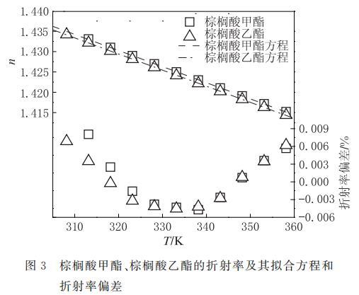 圖3 棕櫚酸甲酯、棕櫚酸乙酯的折射率及其與方程(4)計算值的偏差