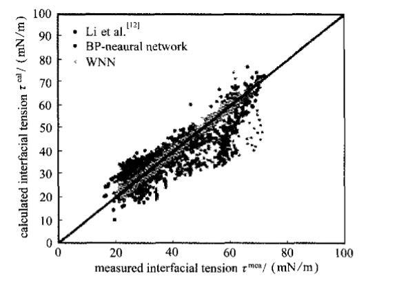 本研究創(chuàng)新性地構(gòu)建了小波神經(jīng)網(wǎng)絡(luò)模型來(lái)進(jìn)行界面張力預(yù)測(cè)。該模型本質(zhì)上是將小波分析理論與傳統(tǒng)的BP神經(jīng)網(wǎng)絡(luò)相結(jié)合。其核心優(yōu)勢(shì)在于,用具有良好局部時(shí)頻特性的小波基函數(shù)(本研究采用Morlet小波)替代了傳統(tǒng)S型函數(shù)作為隱含層的激活函數(shù)。小波基函數(shù)具有伸縮和平移的能力,能更有效地捕捉和逼近數(shù)據(jù)中不同頻率的特征,從而在理論上賦予了網(wǎng)絡(luò)更強(qiáng)的函數(shù)逼近能力和容錯(cuò)性能,有助于克服傳統(tǒng)BP神經(jīng)網(wǎng)絡(luò)易陷入局部極小值、對(duì)初始權(quán)重敏感等固有缺陷。模型的構(gòu)建與訓(xùn)練過(guò)程嚴(yán)謹(jǐn):首先將全部數(shù)據(jù)隨機(jī)劃分為訓(xùn)練集和測(cè)試集;通過(guò)試算法優(yōu)化網(wǎng)絡(luò)結(jié)構(gòu),即系統(tǒng)性地改變隱含層神經(jīng)元數(shù)量進(jìn)行多次訓(xùn)練,最終確定了輸入層6個(gè)節(jié)點(diǎn)、隱含層16個(gè)節(jié)點(diǎn)、輸出層1個(gè)節(jié)點(diǎn)(即6-16-1)的網(wǎng)絡(luò)架構(gòu)為最優(yōu),該結(jié)構(gòu)在保證精度的同時(shí)避免了過(guò)擬合。模型通過(guò)最速下降法與動(dòng)量因子結(jié)合的方法進(jìn)行迭代訓(xùn)練,不斷調(diào)整層間連接權(quán)重及小波函數(shù)的伸縮平移參數(shù),直至預(yù)測(cè)誤差最小化。