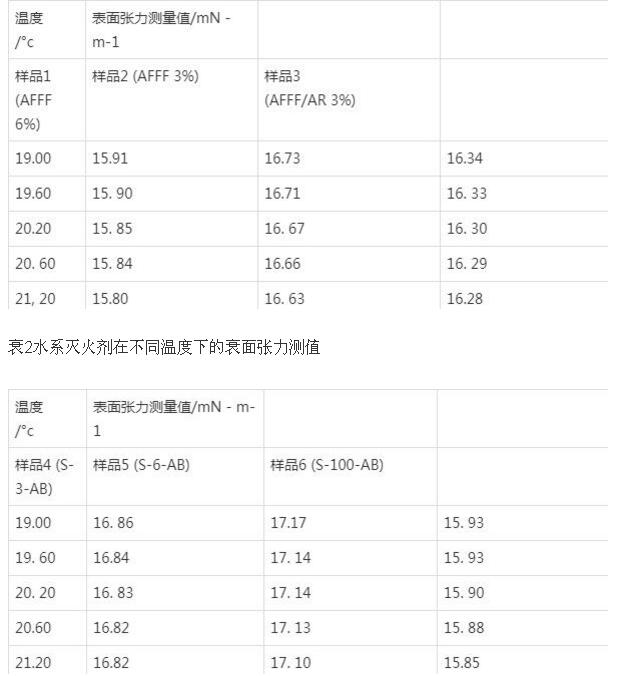 溫度條件對于液體表面張力存在著很大的影響。大 量試驗數據表明,液體的表面張力會隨著溫度的升高而 降低。通過對一系列流體滅火劑產品,包括不同配比的 泡沫滅火劑(成膜型)、水系滅火劑等樣品進行測試,可以 清晰地從表1、表2中看出,溫度的變化對流體型滅火剤 的表面張力存在一定程度的影響。
