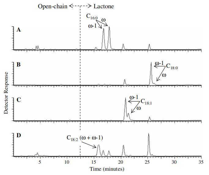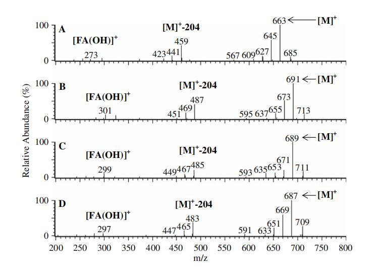 圖3正大氣壓化學(xué)電離(APCI)-來自圖2中每個TIC色譜圖基峰的質(zhì)譜圖。 圖2的TIC中的C16:0二乙酰化槐脂內(nèi)酯(RT=16.7分鐘)、圖2的TIC中的C18:0二乙酰化槐脂內(nèi)酯(RT=25.2分鐘)、圖2c的TIC中的C18:1二乙酰化槐脂內(nèi)酯(RT=20.7分鐘)和圖2d的TIC中的C18:2二乙酰化槐脂內(nèi)酯(RT=15.8)。 ([M]+=質(zhì)子化分子離子;[M]+-204=質(zhì)子化分子離子-減去乙酰化己糖(質(zhì)量204);[FA(OH)]+=質(zhì)子化羥基脂肪酸)