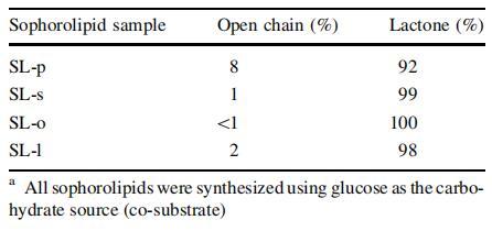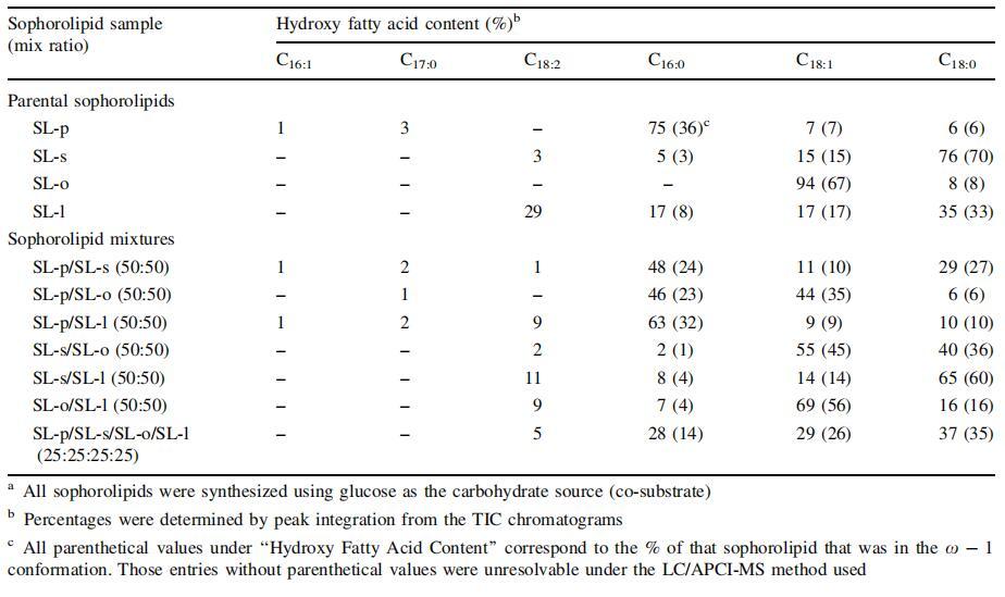 表1:通過LC/APCI MSa測定的由C.bombicola從棕櫚酸(SL-p)、硬脂酸(SL-s)、油酸(SL-o)、亞油酸(SL-l)酸生產(chǎn)的槐脂的結(jié)構(gòu)含量(開鏈與內(nèi)酯)