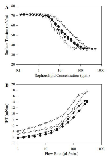 槐脂(SLs)相對較大的生產(chǎn)能力、可再生性和“生態(tài)友好性”有助于提高其作為家庭和個人護(hù)理產(chǎn)品中某些石化表面活性劑的添加劑或替代品的工業(yè)意義。 然而,為了考慮用于工業(yè)用途,SLs也必須廉價生產(chǎn),并且必須了解和控制其物理性質(zhì),以便準(zhǔn)確預(yù)測SLs在各種應(yīng)用中的潛力。 表面張力(ST)、臨界膠束濃度(CMC)、界面張力(IFT)和水溶性是表面活性劑應(yīng)用特別關(guān)注的四個性質(zhì)。 理想情況下,良好的表面活性劑是水溶性的,表現(xiàn)出較低的CMC,并導(dǎo)致最小表面張力(min.ST)小于30 mN/m。 這些性質(zhì)中的每一種都可以根據(jù)表面活性劑的化學(xué)組成進(jìn)行控制。 通過在多種不同的混合基質(zhì)(包括葡萄糖和4種不同的脂肪酸)上生長棉鈴蟲,我們產(chǎn)生了具有不同化學(xué)分布的SLs。 簡單地通過改變脂肪酸來生產(chǎn)不同的SLs的能力提供了在發(fā)酵水平上管理物理性質(zhì)的前景,并通過在應(yīng)用水平上以不同的比例混合SLs。