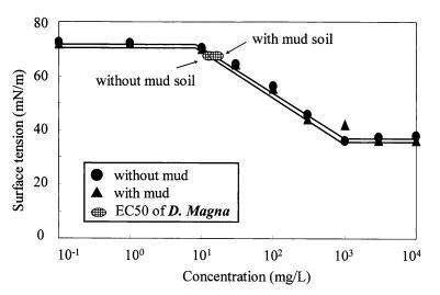 表面活性劑溶液中吸附劑的存在會(huì)影響表面活性劑溶液的體積濃度,因?yàn)樗鼈儠?huì)引起界面活性的變化。 因此,以淤泥作為表面活性劑吸附劑,測(cè)試了表面張力與毒性之間的關(guān)系,以闡明吸附劑的存在對(duì)表面活性劑溶液γtox的影響。 圖11、圖12和圖13顯示了存在泥質(zhì)土壤時(shí),LAS、AE8和AS的表面張力和毒性之間的關(guān)系。 在LAS和AE8的情況下,泥質(zhì)土壤的存在降低了表面活性劑的界面活性和毒性。 然而,吸附劑的存在并未改變LAS和AE8的γtox值。 在AS的情況下,添加泥質(zhì)土壤幾乎不會(huì)對(duì)表面張力值或毒性值產(chǎn)生影響。