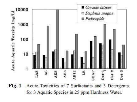 使用3種測(cè)試生物:米齊亞屬latipes、大型水蚤(daphnia magna)和podocopida,測(cè)定了7種表面活性劑和3種商用洗滌劑的急性毒性。 結(jié)果如圖1所示。 在所有情況下,足爪螨的EC50和/或LC50均高于寬脊稻和大型水蚤。 肥皂和LB對(duì)稻瘟病菌的毒力值高于對(duì)大型水蚤的毒力值,而其他5種表面活性劑對(duì)稻瘟病菌和大型水蚤的毒力值幾乎相等。 表面活性劑可分為3類(lèi); 低毒組(AES、SOAP和AE12)、中毒組(LAS和AS)和高毒組(AE8和LB)。