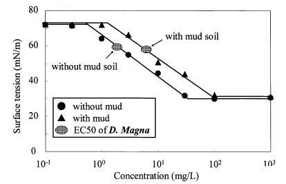 圖11泥質(zhì)土壤存在對(duì)LAS表面張力曲線和大型水蚤有毒表面張力值的影響。