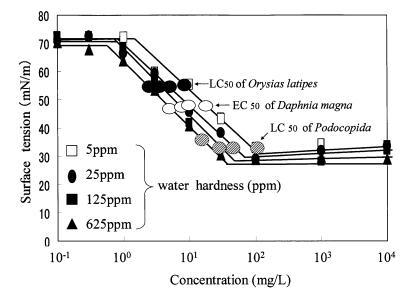 圖8水硬度對(duì)肥皂表面張力曲線的影響以及3種水生物種的有毒表面張力值。
