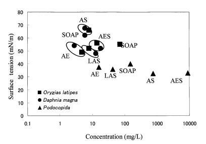 圖2顯示了五種不同表面活性劑(LAS、AE8、AES、AS和SOAP)的γtox和水生毒性值之間的關(guān)系。 野生稻的γtox值與大型水蚤相近。 LAS、AE8、AES-AS和SOAP的γtox值分別為50、50、50、65-70和60mn/m。 另一方面,所有五種表面活性劑的podocopida的γtox值均低于40 mN/m。