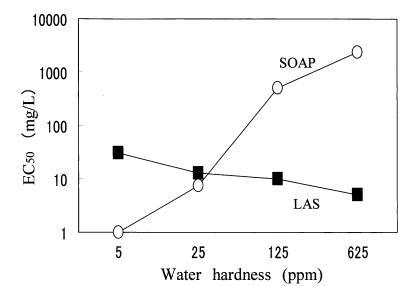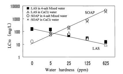 在預(yù)試驗(yàn)中,大型水蚤在4鹽混合溶液中存活,但在CaCl2?H2O溶液或蒸餾水中不能存活。 另一方面,角鯊在所有3種水中都能存活。 因此,使用podocopida研究了水硬度成分對(duì)LAS和肥皂毒性的影響。 如圖3所示,CaCl2?H2O溶液和4-鹽混合溶液的毒性值沒(méi)有差異。 肥皂的毒性隨水硬度的增加而降低,LAS的毒性隨水硬度的增加而增加。