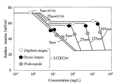 肥皂的毒性值繪制在圖8的表面張力曲線上。 可以確定,寬脊稻和波多西稻的γtox值分別約為55 mN/m和40-45 mN/m。 然而,大型水蚤的γtox值有兩個(gè)范圍:硬度為5ppm時(shí)為73mn/m,硬度為25-625ppm時(shí)約為60mn/m。