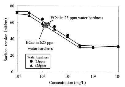 圖9水硬度對(duì)烷基硫酸鹽表面張力曲線的影響以及對(duì)大型水蚤的有毒表面張力值。