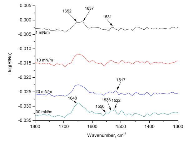 圖7顯示了HI-Langmuir單層在不同表面壓力下60°時(shí)的p極化。 這條帶子在1517厘米處 ? 1對(duì)應(yīng)于α-螺旋。 在1 mN/m的表面壓力下,有兩個(gè)可見(jiàn)帶:1652和1637 cm ? 1. 隨著表面壓力的增加,這兩個(gè)譜帶重疊并成為一個(gè)寬帶。 在30百萬(wàn)米 ? 1,波段可視為單個(gè)波段,頻率為1648厘米 ? 1. 這是對(duì)應(yīng)于α-螺旋的酰胺II區(qū)域的條帶。 下一個(gè)波段在1531厘米處以1 mN/m的寬帶出現(xiàn) ? 1. 隨著表面壓力的增加,它分成三個(gè)帶:1550、1536和1522厘米 ? 1. 在1550和1522厘米處的頻帶 ? 1分別對(duì)應(yīng)于α-螺旋和β-折疊中的酰胺II區(qū)域。 這種譜帶分裂表明,譜帶位于1531厘米處 ? 在較低的表面壓力下,1由α-螺旋和β-片組成。 在較高的表面壓力下,譜帶分離為離散的單個(gè)峰。 光譜中出現(xiàn)的其他峰是由于氨基酸和烷烴鏈的存在。 這條帶子長(zhǎng)1448厘米 ? 1對(duì)應(yīng)于C ? H CH2和CH3的剪切。 HI-Langmuir單分子膜的p-極化輻照度中存在所有三個(gè)表明α-螺旋的主譜帶。