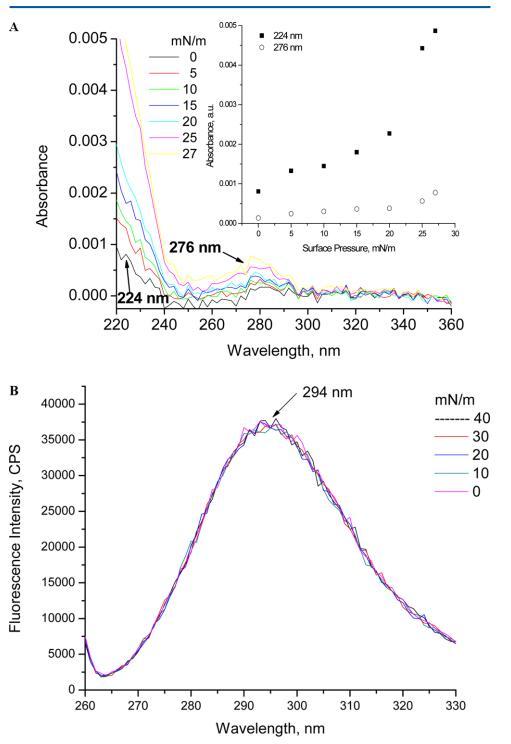 圖5.(A) 紫外線 ? 亞相pH值為5.6時(shí)人胰島素Langmuir的可見(jiàn)光譜。 插圖顯示了224和276 nm處吸光度隨表面壓力的變化。 (B) 亞相pH 5.6下人胰島素朗繆爾的熒光光譜(λ激發(fā)=270 nm,激發(fā)和發(fā)射時(shí)的狹縫寬度分別為5和5 nm)。
