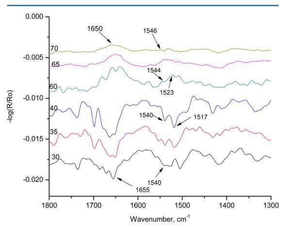 給出了三種IRRAS光譜。 圖7顯示了不同表面壓力下60°的極化,圖8顯示了10 mN/m的恒定表面壓力和30到70°范圍內(nèi)的變化角度,圖9顯示了25°恒定角度和變化表面壓力下的s極化。 表2給出了α-螺旋和β-片的譜帶特征以及對(duì)應(yīng)于α-螺旋的酰胺I和酰胺II振動(dòng)。