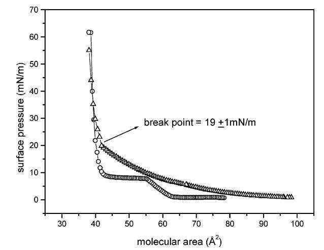 圖1.朗繆爾單分子膜的表面壓力-面積曲線:純DMPA(O)和DSAP/DMPA(1:3500,mol:mol)(4)。 曲線中顯示的斷點與混合單層的LE-LC轉(zhuǎn)變有關(guān)。
