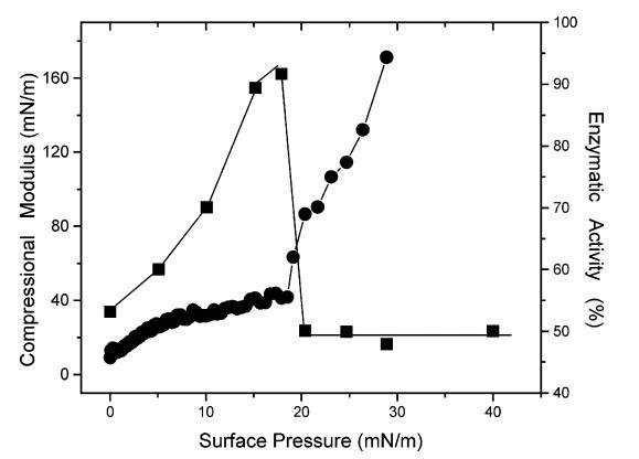 圖3.(9)在幾種表面壓力下,DSAP/DMPA(1:3500,mol:mol)混合單分子膜中DSAP的PNPPA酶活性。(b)DSAP/DMPA混合單分子膜的壓縮模量。酶活性表示為均相介質(zhì)中估計值的百分比。