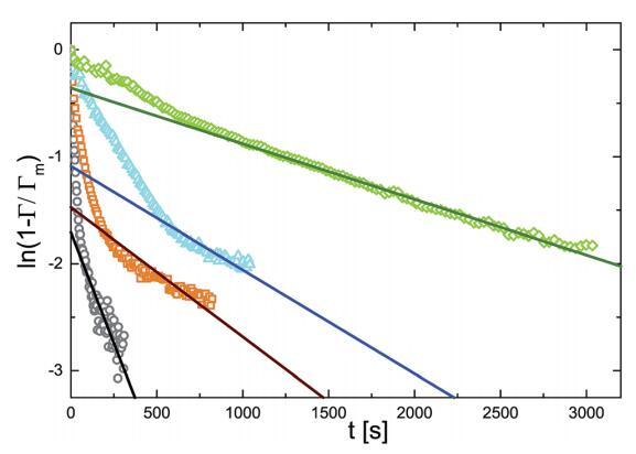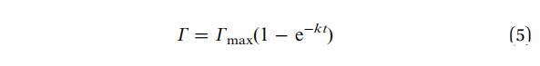 當系統接近飽和時,G(t)的下降速度必須隨著表面變得擁擠而減慢。吸附質濃度剛好低于表面,然后與吸附物種失去平衡,動力學受到吸附屏障的限制。一級動力學過程會導致: