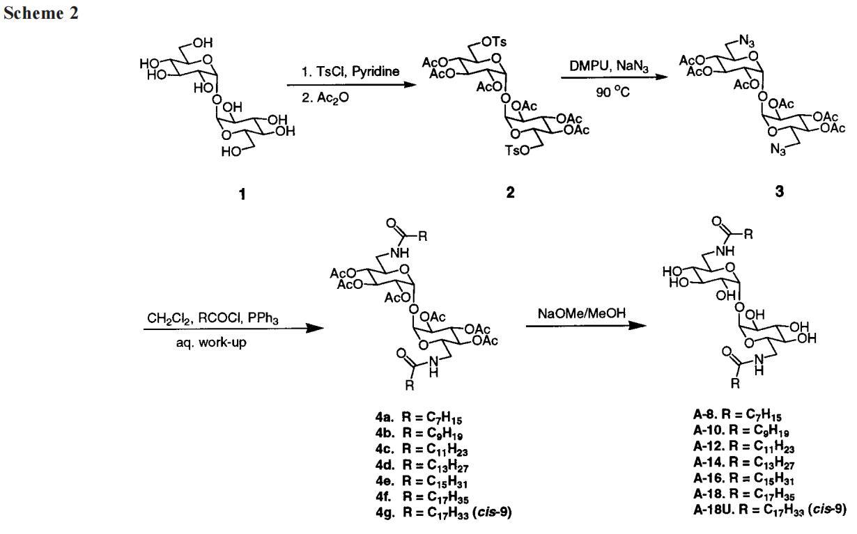 2,3,4,2′,3′,4′-六鄰乙酰基-6,6′-二十八胺基-6,6′-二脫氧-r,r-D-海藻糖,4a。按照上述一般程序,2.1 g(3.3 mmol,6.5 mmol當(dāng)量)3,50 mL CH2Cl2和2.7 mL(9.8 mmol)辛酰氯,以及2.4 g(9.2 mmol)PPh3與15 mL CH2-Cl2反應(yīng)。黑色固體被過濾,留下栗色溶液。洗滌和干燥后,對所得棕色糖漿進(jìn)行色譜分析,得到2.2 g(80%)4a,白色固體,mp 70-72°C。