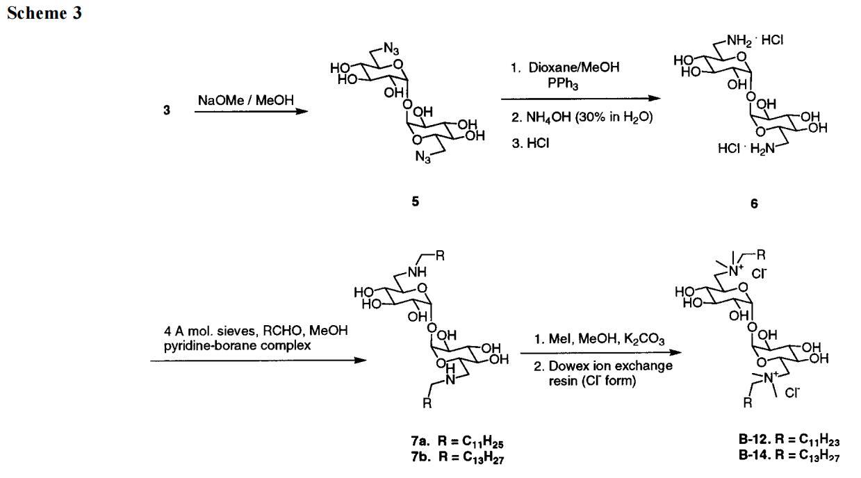 方案2和方案3以及實(shí)驗(yàn)部分詳述了我們獲得A系列和B系列海藻糖雙子的方法。另外幾條評論有助于美化這一信息。B型海藻糖雙子最明顯的先驗(yàn)途徑是用長鏈?zhǔn)灏分苯尤〈?的甲苯磺酰化基團(tuán)。盡管沿著這些路線進(jìn)行了多次嘗試,但只獲得了分解產(chǎn)物或起始材料。然而,如方案2所示,我們成功地用疊氮化合物取代了2的兩個甲苯磺酰化物,得到了3。此處采用文獻(xiàn)程序28,但出于安全考慮,HMPA被DMPU取代作為溶劑。然后,雙疊氮化物3經(jīng)過Staudinger反應(yīng)25,29,在一個步驟中得到長鏈雙酰胺4a-g,而該長鏈雙酰胺4a-g只需脫保護(hù)即可獲得a系列雙子。在方案3中,脫保護(hù)糖5的疊氮化物還原將化合物轉(zhuǎn)化為二伯胺鹽酸鹽6。長鏈醛與6和吡啶硼烷絡(luò)合物30的還原胺化得到海藻糖衍生物7。使用NaBH3-CN作為還原劑,該反應(yīng)的產(chǎn)率很低。在用甲基碘化物將7甲基化,然后進(jìn)行離子交換(以促進(jìn)純化和提高溶解性)之后,我們得到了B系列海藻糖雙子。