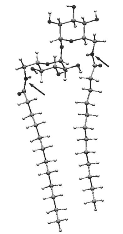 計(jì)算首先將海藻糖插入宏模型程序42,并對結(jié)構(gòu)進(jìn)行琥珀色能量最小化。從使用琥珀色*力場的25000個構(gòu)象搜索中,我們選擇了能量最低的構(gòu)象,該構(gòu)象恰好與報(bào)告的X射線結(jié)構(gòu)重疊。43,44接下來,該結(jié)構(gòu)中的6-和6′-羥基被乙酰氨基取代。在模擬的水環(huán)境中,用AMBER*再次進(jìn)行了25000次構(gòu)象搜索。然后乙酰基被十二烷基取代,然后對生成的a-12雙子座進(jìn)行了另一次搜索。結(jié)果表明,整個構(gòu)象由酰胺羰基和相鄰葡萄糖環(huán)的2-羥基之間的兩個分子內(nèi)氫鍵控制。氫鍵導(dǎo)致兩條全反式鏈彼此擺動約95°。A-12的固態(tài)紅外光譜證實(shí)了這種相互作用,該光譜顯示1646 cm-1處有羰基帶,而Hecameg的羰基帶為1700 cm-1,單體葡萄糖類似物的羰基帶為1698 cm-1。25由于這種構(gòu)象會不切實(shí)際地排除分子內(nèi)疏水締合,而且在任何情況下,羰基氫鍵位點(diǎn)的溶劑可能會淹沒在水中,我們故意不允許-CdO氫鍵,并重新計(jì)算。通過這種方式,我們得到了圖6。可以看到,一條鏈上大約有八個碳與其伙伴鏈的碳并排排列。N/N距離僅為7.4?,整體分子形狀為“管狀”。用另一種方式說,糖的頭基延伸的距離不比兩條鏈的寬度大多少,就像人們預(yù)期的一種易于堆積成雙層的化合物那樣。45因此,正如前面從實(shí)驗(yàn)數(shù)據(jù)得出的結(jié)論,海藻糖更像是一個統(tǒng)一的頭基,而不是一個可以有效隔離鏈的長間隔基。