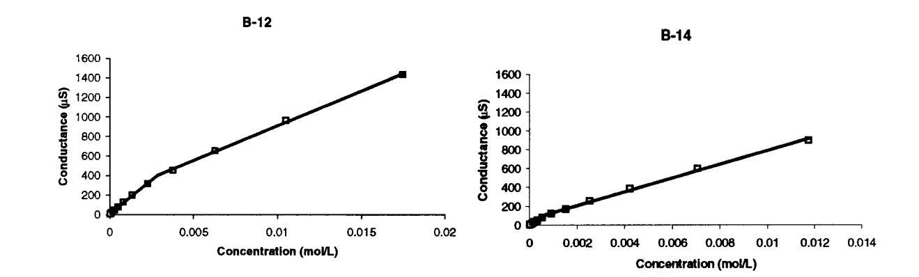 圖5。圖中給出了B-12和B-14臨界膠束濃度,該濃度由電導(dǎo)-濃度曲線中的斷裂點(diǎn)確定。每個點(diǎn)代表23°C下的單個電極讀數(shù)。