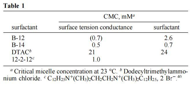 B-12和B-14確實(shí)是水溶性化合物,在臨界膠束濃度(CMC)以上形成膠束,動態(tài)光散射顯示顆粒大小小于5nm。CMC值是通過表面張力-濃度曲線(圖4)和電導(dǎo)率-濃度曲線(圖5)中的斷裂來確定的。38表1給出了結(jié)果數(shù)據(jù)(以及兩種常規(guī)表面活性劑的數(shù)據(jù),用于比較)。如圖所示,B-12的CMC值通過張力測量法和電導(dǎo)測量法(這兩種方法都是可重復(fù)的)得出的結(jié)果不一致。這種差異至少部分可以追溯到B-12表面張力的時間依賴性。因此,在10分鐘的過程中,B-12水溶液的表面壓力增加了10 mN/m,之后趨于穩(wěn)定。這種動態(tài)表面張力過程(之前已經(jīng)用雙子座表面活性劑觀察到)13,15,39可能與雙子座表面活性劑在空氣/水界面組織方面的困難有關(guān)。為了解決這個問題,圖4中的B-12溶液在表面張力測量之前老化20分鐘,從而減少了系統(tǒng)尚未平衡的可能性。盡管采取了這種預(yù)防措施,但我們無法確定依賴時間的界面重組是否不會影響B(tài)-12圖,并導(dǎo)致基于張量和電導(dǎo)的數(shù)據(jù)之間的差異。當(dāng)然,后者來源于不受界面事件影響的大塊特性,因此更可靠。有趣的是,B-14沒有表現(xiàn)出隨時間變化的表面張力,兩種方法確定的CMC值是合理一致的。也許更長的鏈既增強(qiáng)了對空氣/水界面的親和力,也增強(qiáng)了從溶液中吸收界面的動力學(xué)。