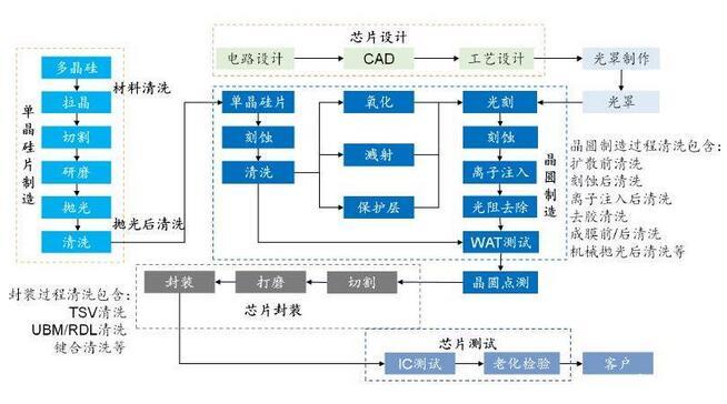 芯片制造技術的進步驅動半導體清洗技術快速發展。在單晶硅片制造中,光刻,刻蝕,沉積等工藝后均設置了清洗工藝,清洗工藝在芯片制造進程中占比最大,隨著芯片技術節點不斷提升,對晶圓表面污染物的控制要求也越來越高。