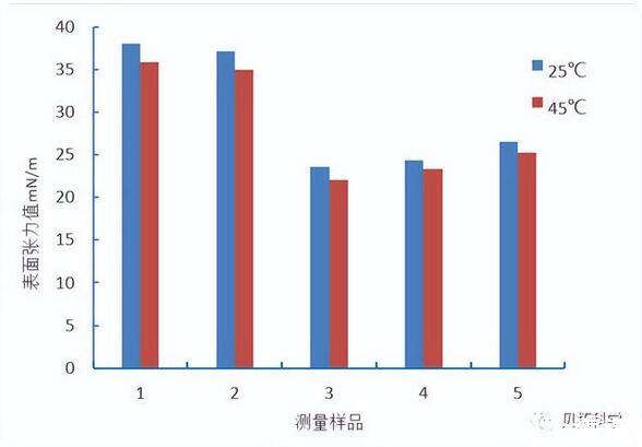 采用鉑金環(huán)法,分別在25℃和45℃的溫度下測(cè)量五種油墨的表面張力值。