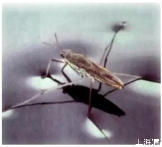 接下來我們看一下,水黽或者繡花針為什么能站在水面上?很顯然不是浮力的作用,如果有福利的話,必須要有排開水的體積。