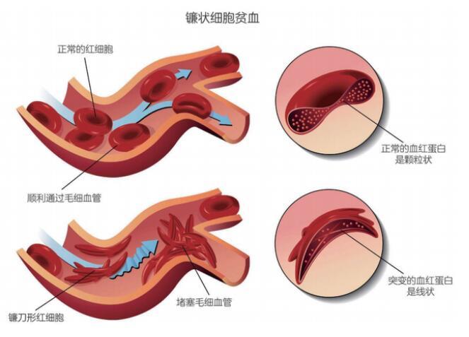 我們的紅細胞原本是中間略扁的圓餅形,這下卻被又長又硬的突變血紅蛋白凝聚物撐成了鐮刀形,不但運輸氧氣的能力大幅下降,還會卡在毛細血管的拐彎處,形成大范圍的栓塞,肝臟、脾臟、紅骨髓等毛細血管豐富的組織都將受到嚴重的損傷。所以,那些從父母雙方繼承的基因都有這個突變的“純合”患者,常常會有生命危險。