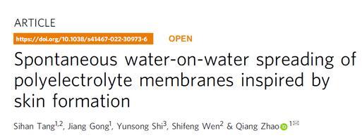 近期,趙強教授課題組在《Nature Communications》在線刊發(fā)了該領域的新進展(Spontaneous water-on-water spreading of polyelectrolyte membranes inspired by skin formation,Nat.Commun.13,3227,2022.),提出了一種聚電解質水溶液在水面自發(fā)鋪展,形成多孔膜的機制。文章第一作者是化學與化工學院2020屆碩士畢業(yè)生湯思晗,合作單位包括華中科技大學材料科學與工程學院,協(xié)和醫(yī)院。研究得到國家自然科學基金,國家重點研發(fā)計劃和三峽實驗室開放基金的支持。