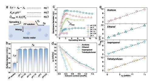 含有聚乙烯亞胺(PEI)和聚苯乙烯磺酸鈉(PSSNa)的水溶液滴在水表面自發(fā)鋪展成膜(圖1,圖2)。一般而言,水溶液液滴與水接觸時首先發(fā)生向水中的擴散與混溶,而非鋪展。為了抑制水-水擴散與混溶,作者設計了PEI-PSSNa和混合溶液,其pH為堿性。當該溶液液滴與酸性水接觸時,水中含有的大量質子促使PEI高分子鏈上的氨基質子化,隨后帶正電的PEI與PSSNa在水-水界面上發(fā)生靜電絡合,有效抑制了溶液向水中的擴散與混溶。與此同時,PEI-PSSNa的表面張力比水低,液滴因此在水表面可自發(fā)鋪展,而非混合。二者協(xié)同,促使了水溶液液滴在水面進行自發(fā)鋪展。