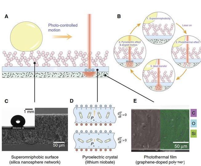 光電微流控平臺的設(shè)計:微流控平臺包括底層的光熱薄膜(石墨烯摻雜的PDMS),中間層的熱釋電晶體(LiNbO3)和上層的超疏液涂層(SiO2納米空心球分形網(wǎng)絡(luò))(圖1)。光束可以穿過上層透明的超疏液涂層和熱釋電晶體照射到底面的光熱薄膜,光熱薄膜將光能轉(zhuǎn)換成熱能使自身溫度升高,從而加熱上方的熱釋電晶體在光束照射處產(chǎn)生表面電荷,當(dāng)電荷引起的介電泳力足以克服液滴在超疏液涂層上的粘附力,液滴則被吸引至光束下方。超疏液涂層不僅為液滴移動創(chuàng)造了極低的阻力,而且避免了液體殘留,使得無損液滴操控成為可能,可以對包括硅油、乙醇、正庚烷和甘油在內(nèi)的30多種液體(表面張力18.9-98.0mN/m)進(jìn)行無損光控操作。