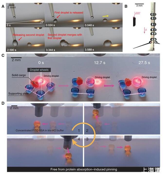 多樣化應(yīng)用:光電微流控技術(shù)可將液滴定向傳輸甚至反重力爬升,在霧氣收集、3D打印、傳熱傳質(zhì)等領(lǐng)域極具應(yīng)用前景;對液滴的精確操控還造就了以液滴為驅(qū)動元件的軟體機(jī)器人,可用于信息通訊、固體傳輸、載藥釋放等關(guān)鍵領(lǐng)域;對高濃度蛋白質(zhì)等生物流體的無損操控使得微反應(yīng)裝置的重復(fù)再用成為可能,有利于減少一次性塑料的使用、減少醫(yī)療廢品、降低成本,助力醫(yī)療檢測、生化分析、微流控等領(lǐng)域的綠色、環(huán)保、可持續(xù)發(fā)展。利用光束精準(zhǔn)遙控各種微液滴,應(yīng)用于病理測試,可避免與感染性流體直接接觸,有利降低一線醫(yī)務(wù)人員在大流行病中測試病毒或細(xì)菌的感染風(fēng)險,以及減少樣本在操控過程中污染的機(jī)會。