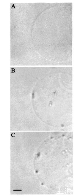 時間蛋白對膜拓撲結構的影響。巨大脂質體是生物膜的優秀模型,因為其尺寸與細胞相當。此外,它們可以通過光學顯微鏡進行觀察(15,21)。我們之前對馬加寧2和吲哚肽的研究表明,這些肽對巨大脂質體膜的拓撲結構有顯著影響(15)。在本研究中,在類似條件下,通過顯微鏡觀察了在巨大囊泡外表面添加這些肽后,temporins對巨大脂質體三維拓撲結構的影響。SOPC巨脂質體即使暴露于大量該肽(約1.2 fmol的temporin B)(每個重復100份12 amol)時,也不受temporin B的影響。同樣,含有膽固醇(Xchol)0.10)的巨大囊泡也不受該量的顳葉素B的影響。然而,在將該肽添加到SOPC和SOPC/膽固醇(Xchol)0.10)巨大脂質體的表面時,偶爾會觀察到相鄰囊泡之間的粘附(數據未顯示)。然而,在POPG(XPOPG)0.10的存在下,已經≈36 amol(10-18 M)的顳葉素B(約60 fL,3次注射)施加在巨大囊泡表面上,引起巨大囊泡膜拓撲結構的顯著變化(圖6,面板B)。具體來說,小顆粒(φ≈10μm),然后進入巨大脂質體的內腔(圖6,面板B)。進一步增加≈0.24 fmol的顳蛋白B(約400 fL,20次注射)導致巨大囊泡內這些顆粒的數量增加(圖6,面板C)。還觀察到巨大囊泡表面的顆粒聚集(圖6,面板C)。隨后,在≈10分鐘后,將顆粒轉移到巨大脂質體的內腔中。