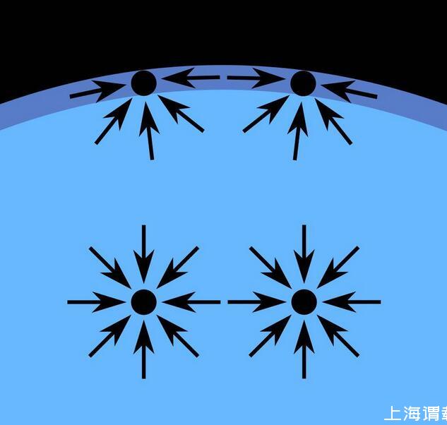 表面張力是流體表面存在的可能收縮到最小表面積的趨勢力;它是液體分子由于凝聚力相互吸引而在其表面形成的內向力;它就像是一張覆蓋在液體表面被拉伸的彈性薄膜,可以承受一定重量的外在壓力。