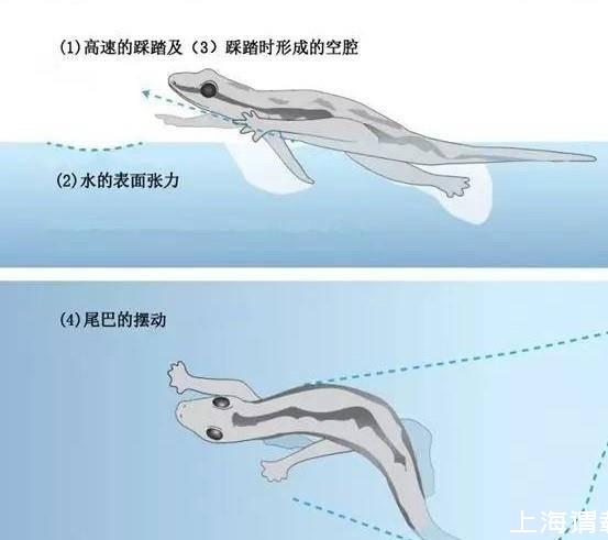 壁虎也可以利用水的表面張力踩水疾行,這項技能往往使它能輕松擺脫捕食者的追擊。