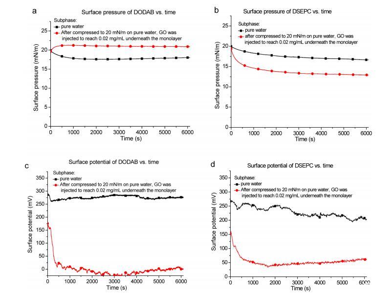 圖2:(a)DODAB和(b)DSEPC單層的表面壓力與經過時間。(c)DODAB和(d)DSEPC單層的表面電位與經過時間的關系。黑色曲線:在純水亞相上將單層壓縮至20 mN/m的表面壓力。紅色曲線:將單層壓縮至20 mN/m后,小心地將600μL 1 mg/mL GO分散液緩慢注入單層下方的水亞相中,使GO達到0.02 mg/mL。