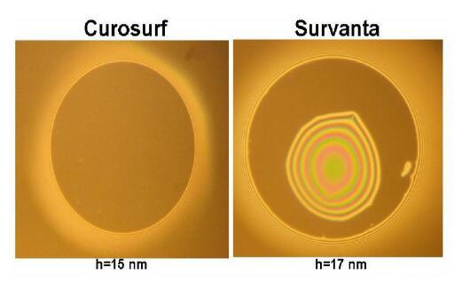 通過Curosurf和白蛋白將PEG 10000包含到混合FFs中不會改變膜類型,并且FFs仍然厚且不均勻。相反,葡聚糖的加入導致了顯著的變化:觀察到薄膜變薄且穩定的黑色薄膜(h=15 nm),類似于在沒有白蛋白的情況下通過Curosurf獲得的薄膜(圖3)。